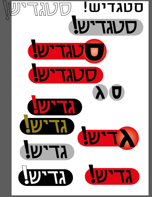 די מהר הגעתי למסקנה שאצטרך ליצור את האותיות בעצמי – לעצב את הפונט למעשה. ולאחר כמה ניסיונות (כל אלו שלמטה משמאל), החלטתי להגדיל את האות הראשונה בללוגו ולהלביש אותה על עיגול עם מעבר צבע – ובאמת להשתשמ בצבעים אדום, לבן ושחור.